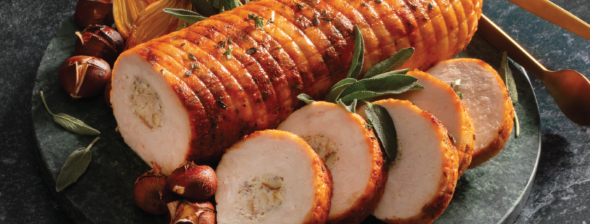 Options are breast meat stuffed with either roasted pistachio & cranberry, or with roasted chestnuts, sage & onion or a plain skin-on turkey breast. They are the perfect centre-piece of a traditional Christmas meal.