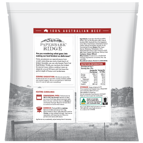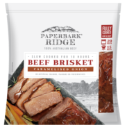 Made in Australia with 100% Australian Beef, Paperbark Ridge Beef Brisket is marinated for several hours in Paperbark Ridge’s own Caramelised Onion Sauce. We slow cook them for 10 hours so you can just take them home, heat and enjoy!