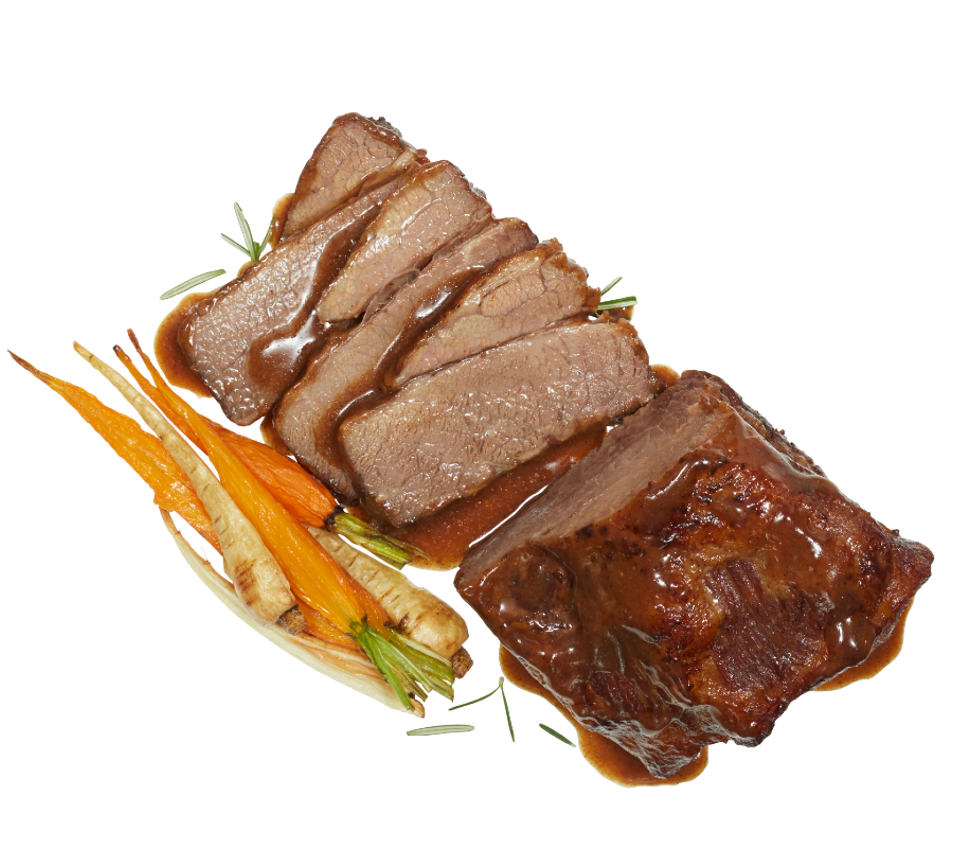 Serve our Paperbark Ridge Caramelised Onion Beef Brisket sliced with creamy mashed potato and roasted vegetables.